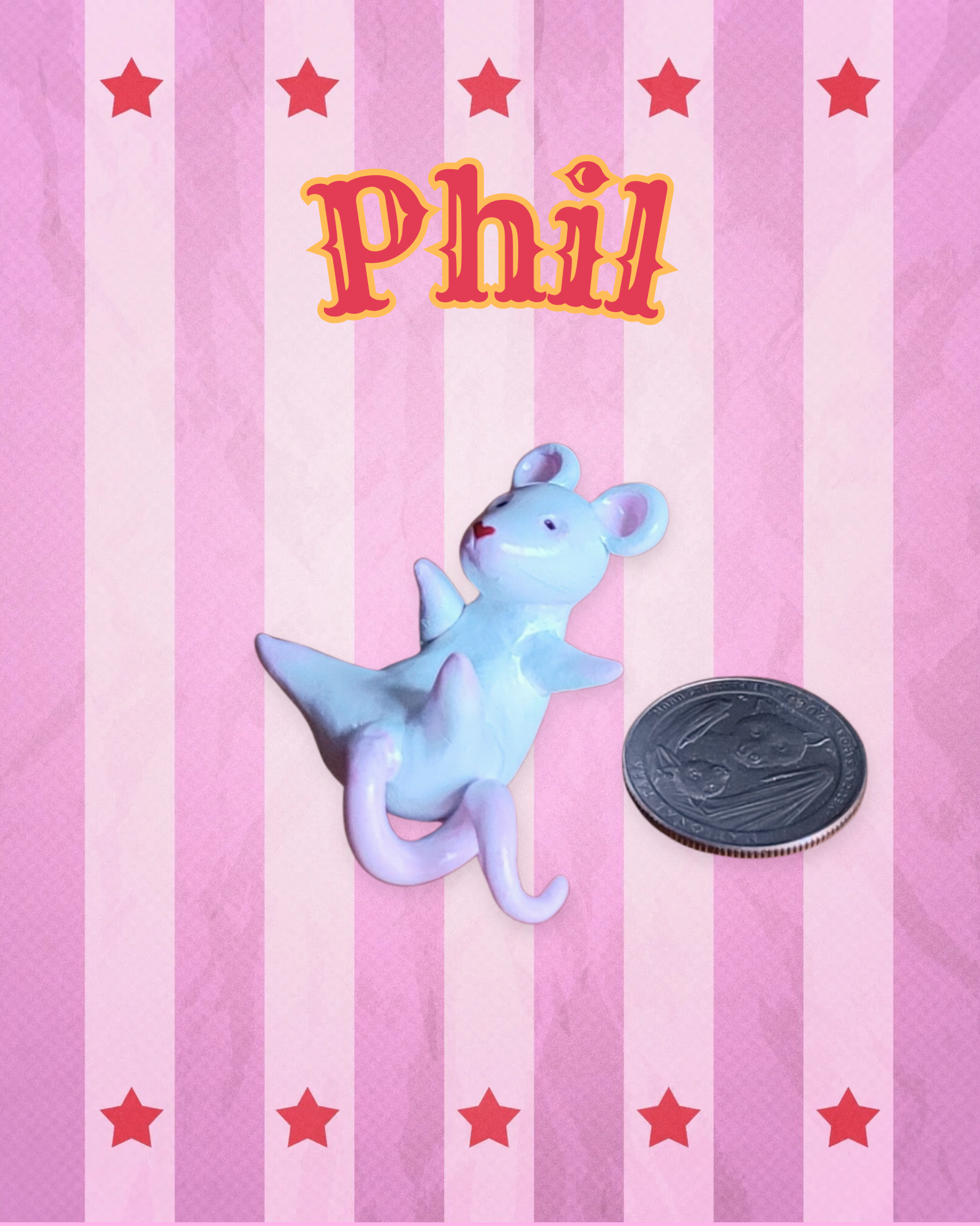 Meet Phil - a tiny, hand sculpted/painted circus mouse. One of a kind. Photographed with a US quarter, for size reference.